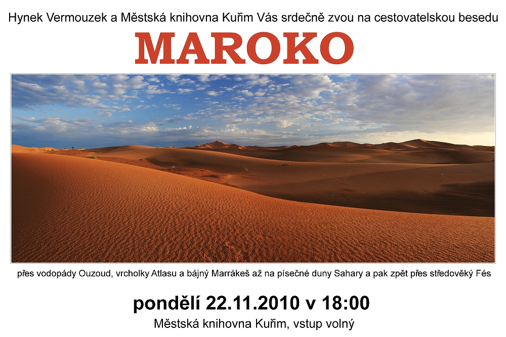 Na přelom léta a podzimu je naplánována další cesta za poznáním, tentokrát na sever Afriky, do Marockého království. Čekají nás stará i moderní města, vodopády, cedrové lesy, noc pod hvězdami na poušťi, koupel v chladném Atlantiku a také pokus o výstup na čtyřtisícový Jebel Toubkal, nejvyšší horu pohoří Atlas a celé severní části Afriky. Další informace a hlavně mapa plánované trasy na samostatné stránce.